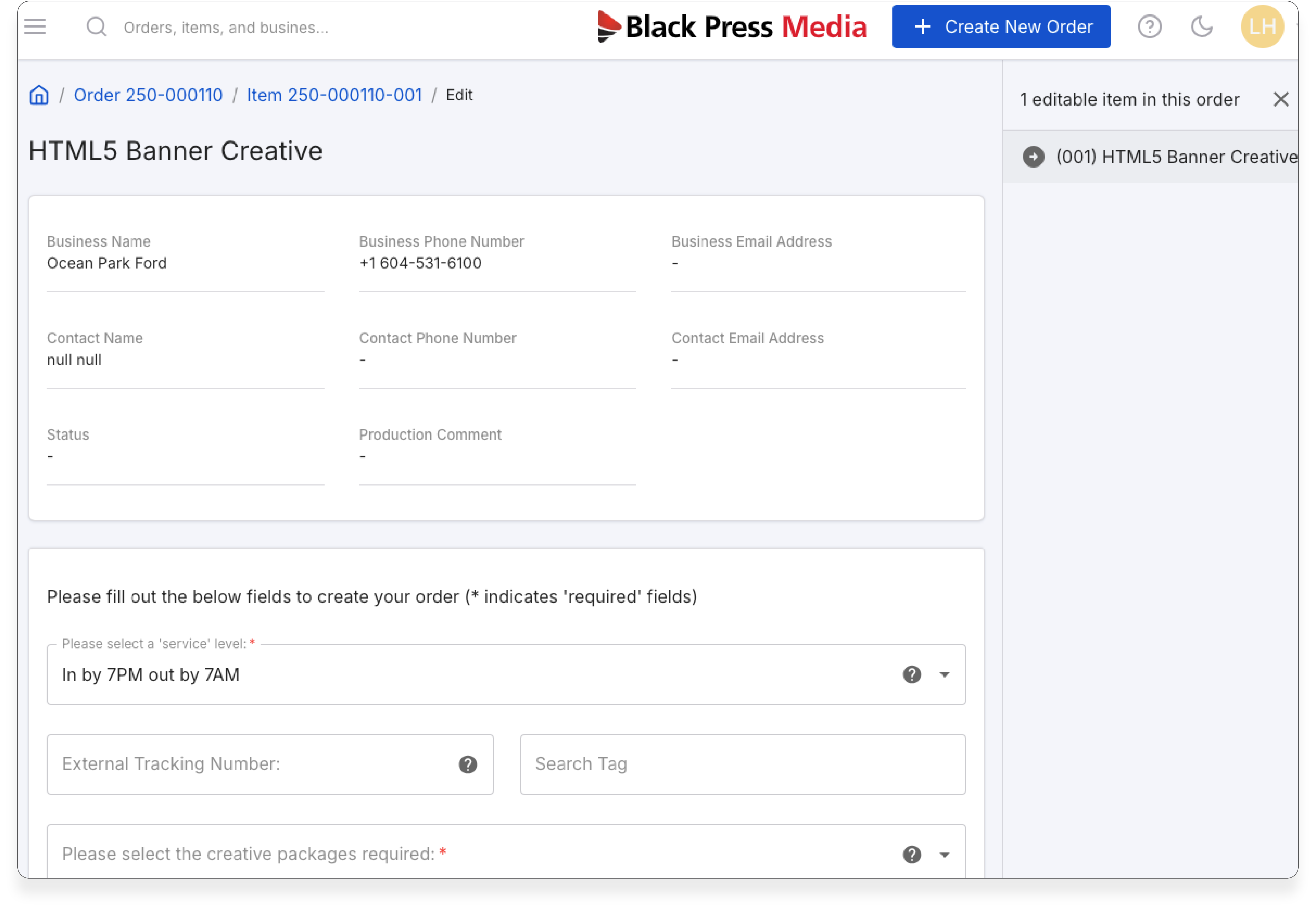 3. After filling in the required fields, proceed by clicking "Create Order."