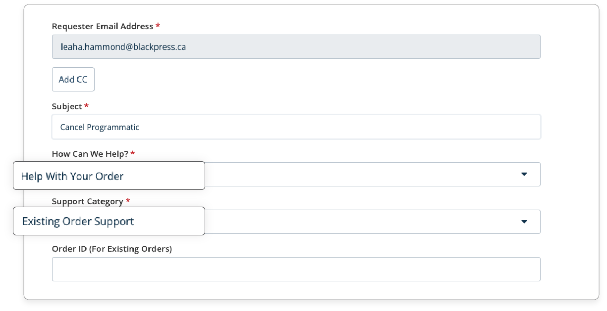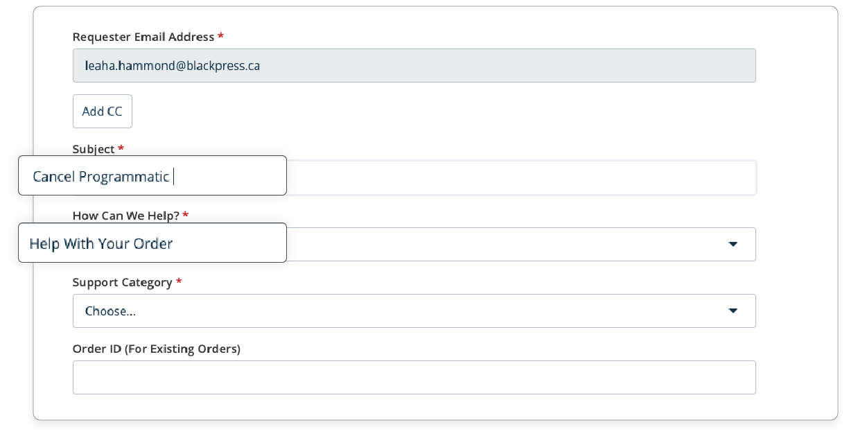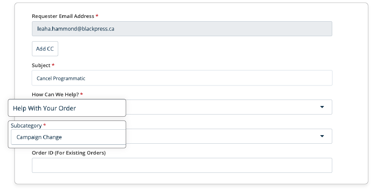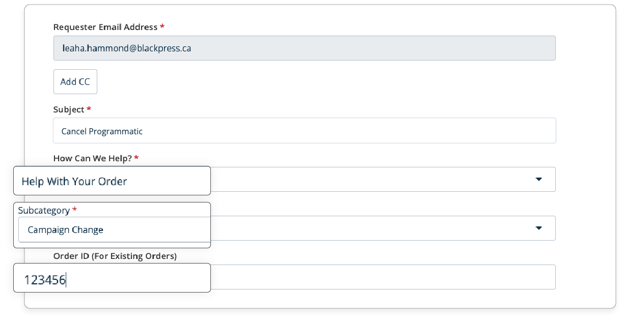 2. Fill in the required fields. In the 'Subject' field, describe the request as 'Cancel Programmatic,' and in the dropdown menu 'How can we help,' select the option 'Help with your order.'