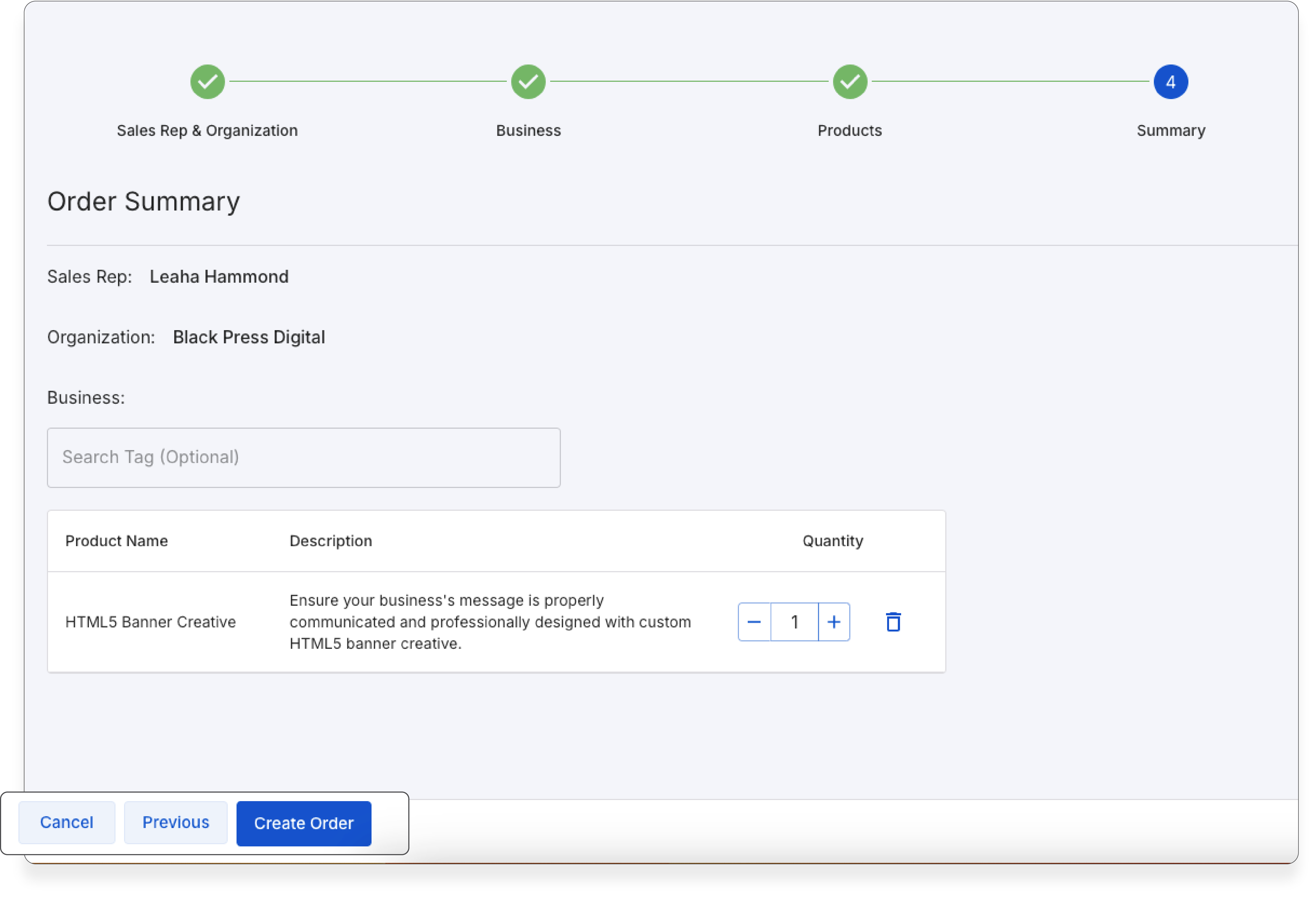 3. After filling in the required fields, proceed by clicking "Create Order."