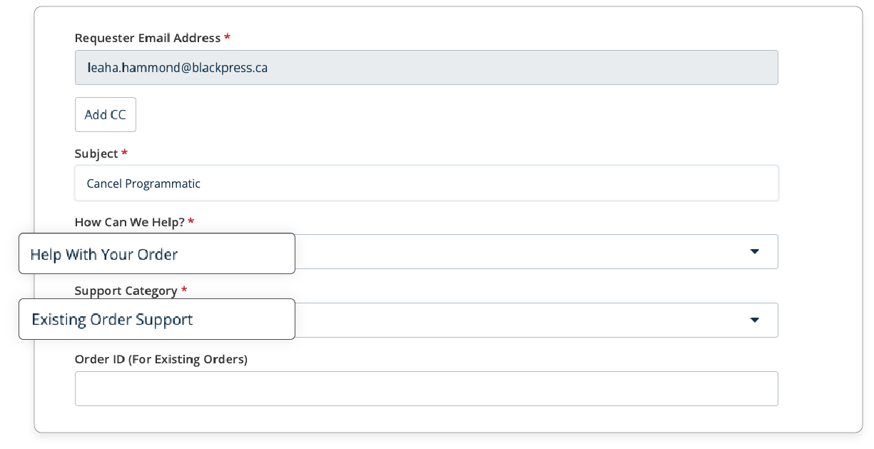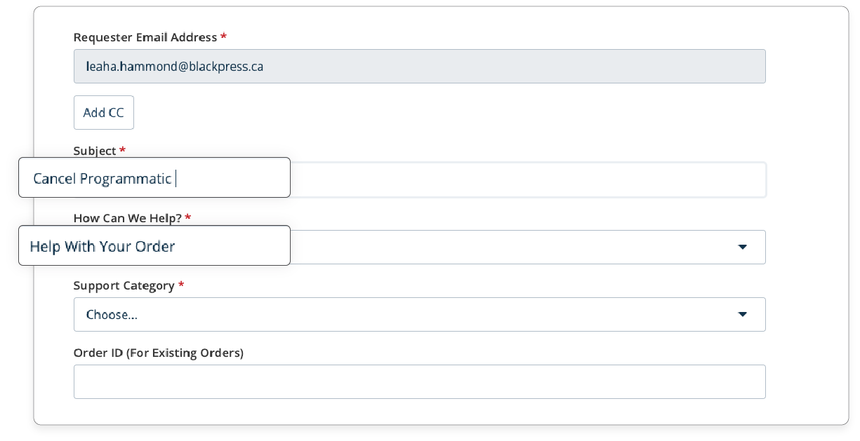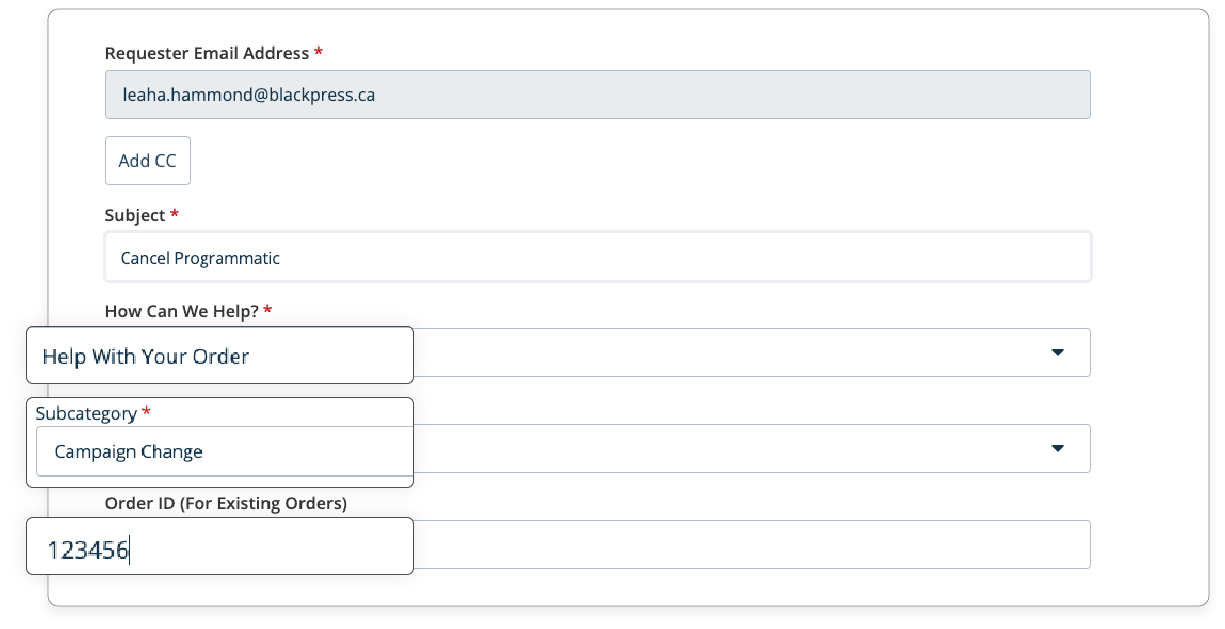 2. Fill in the required fields. In the 'Subject' field, describe the request as 'Cancel Programmatic,' and in the dropdown menu 'How can we help,' select the option 'Help with your order.'